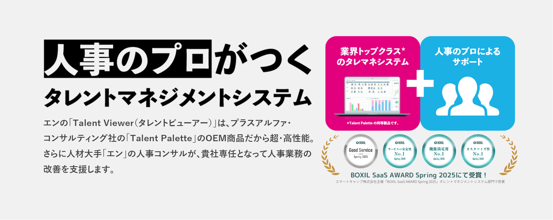 Talent Viewerは、あらゆる人材データを一元化・分析し、組織の力を最大化させるタレントマネジメントシステムです。人事業務を効率化するだけでなく、人材データを分析・活用することで、経営・人事戦略の意思決定、次世代人材の育成、最適配置、離職防止、採用強化など、人事戦略の精度を飛躍的に高めます。エンが人材支援40年の経験を活かし、人事パートナーとしてシステム導入から課題改善まで、一気通貫で支援します。